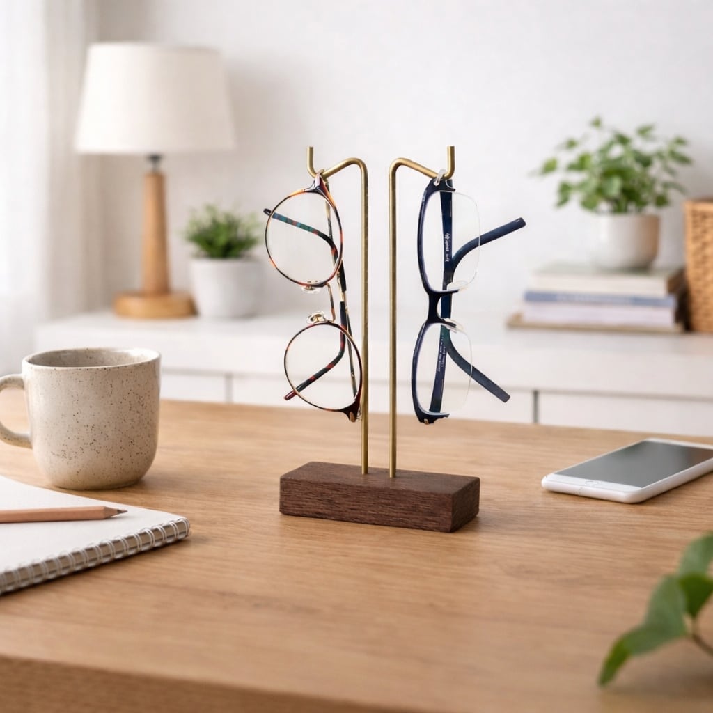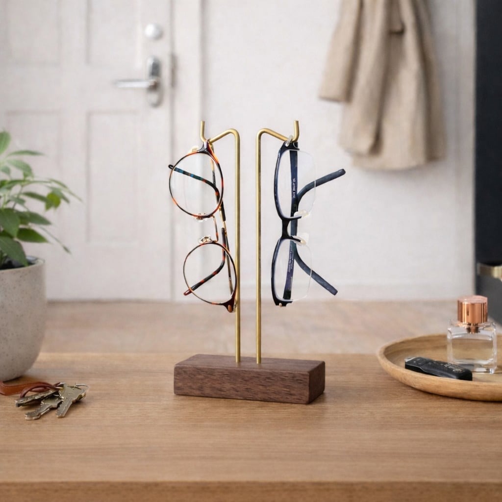 ナチュラルな木の温もりと真鍮の優しい輝きが調和した、暮らしを彩るメガネスタンド。