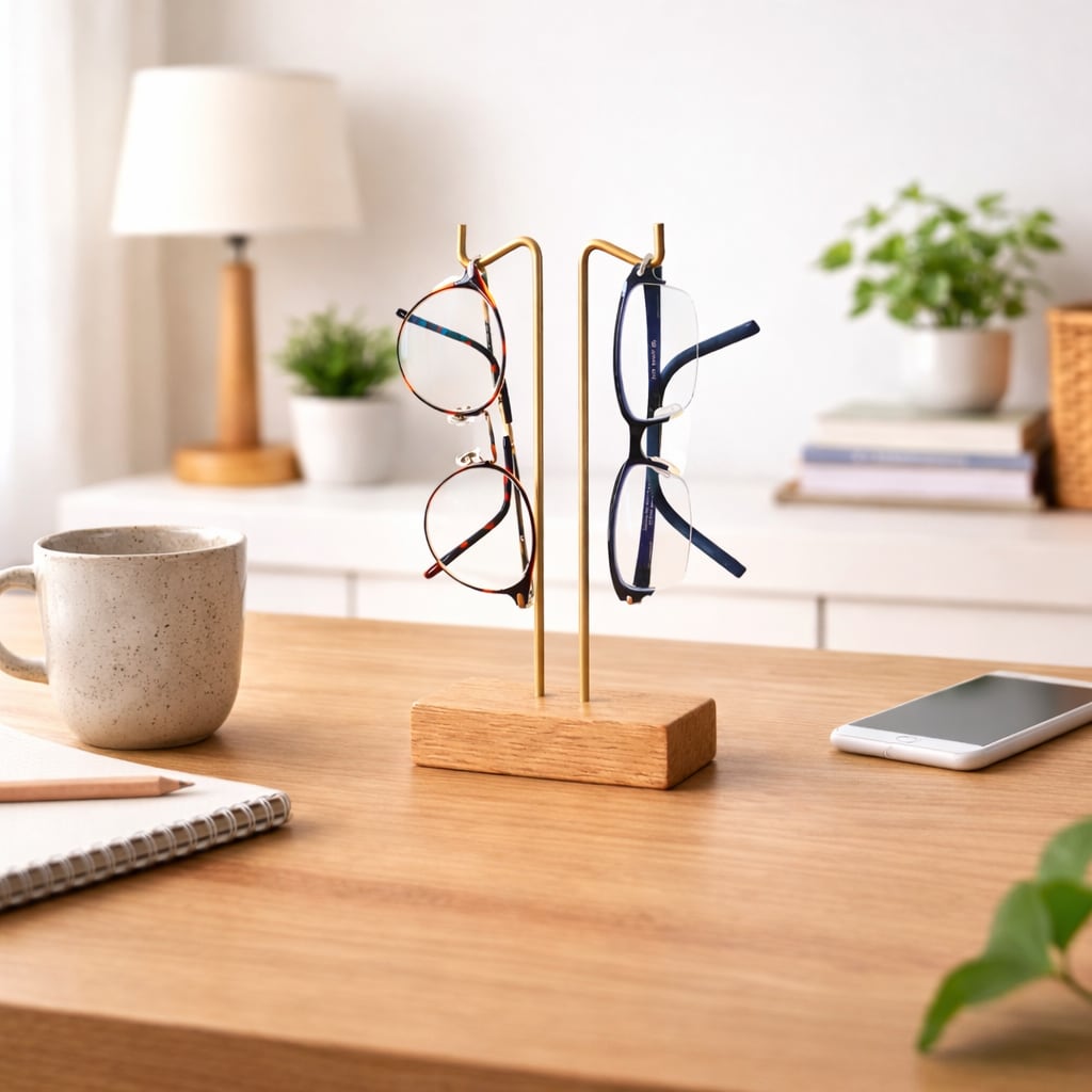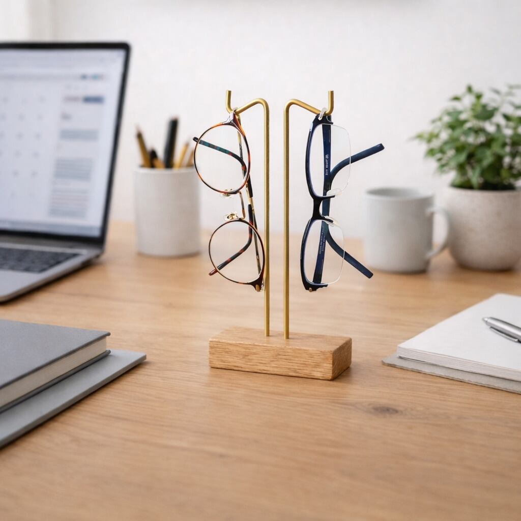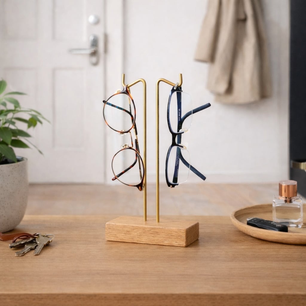 ナチュラルな木の温もりと真鍮の優しい輝きが調和した、暮らしを彩るメガネスタンド。